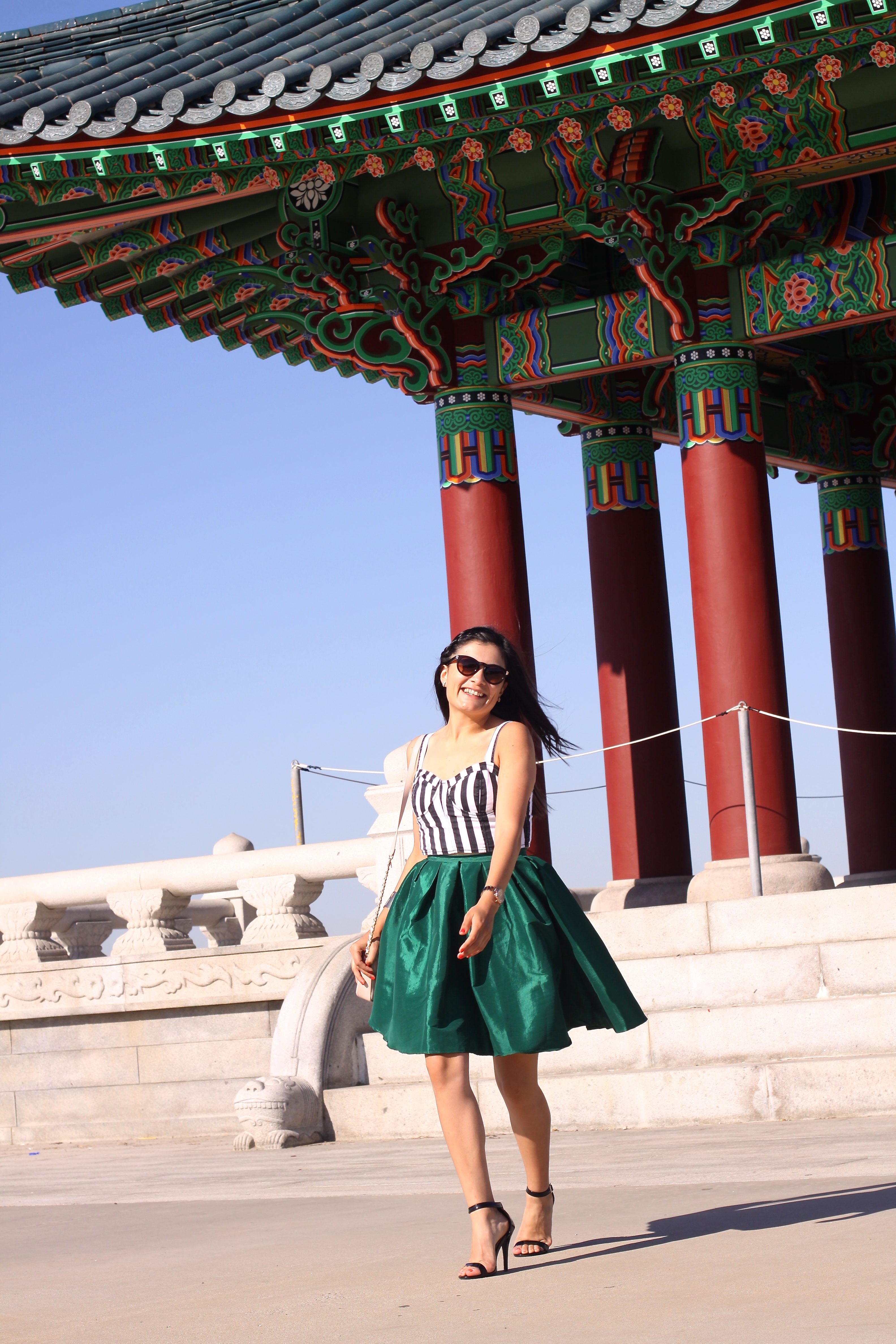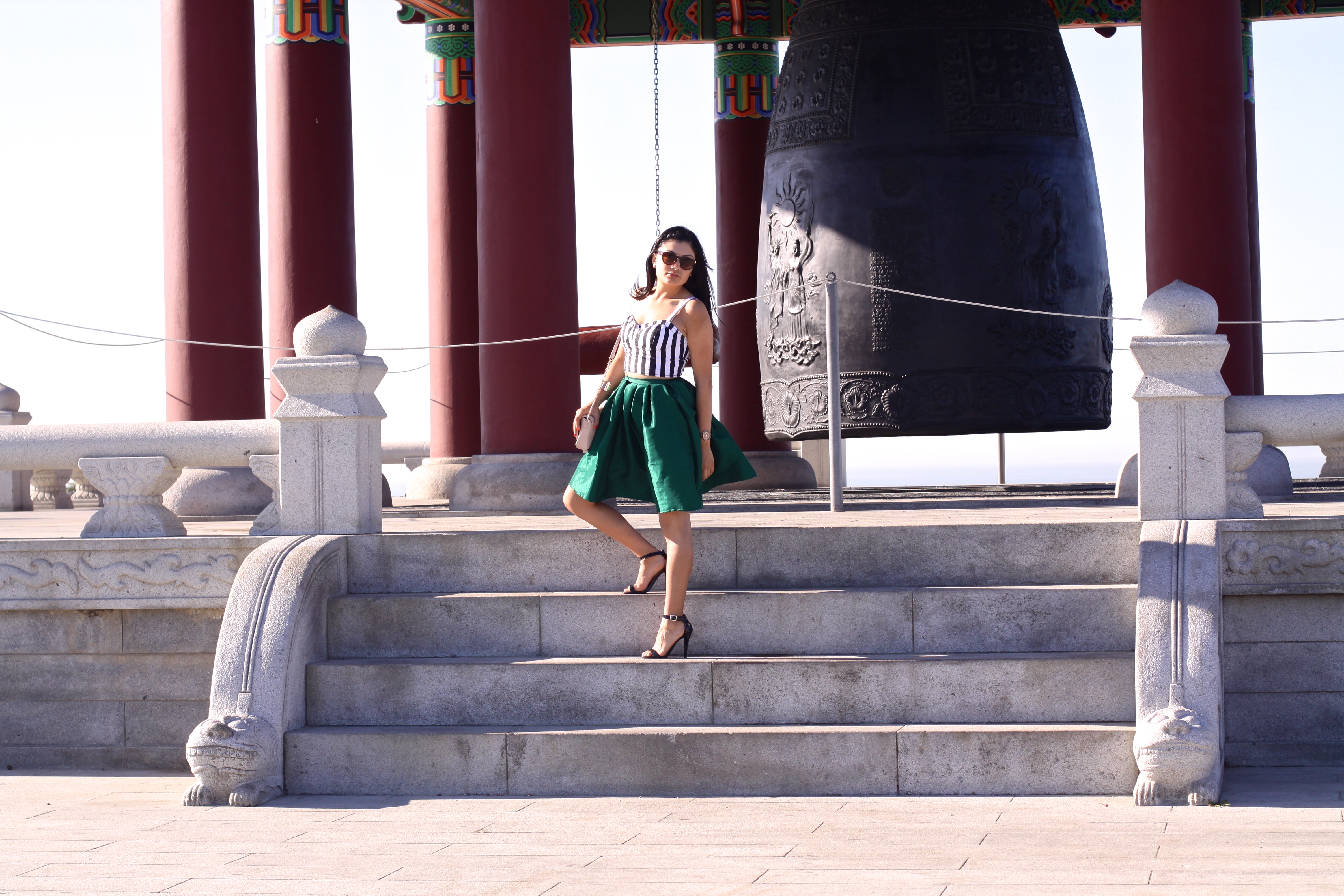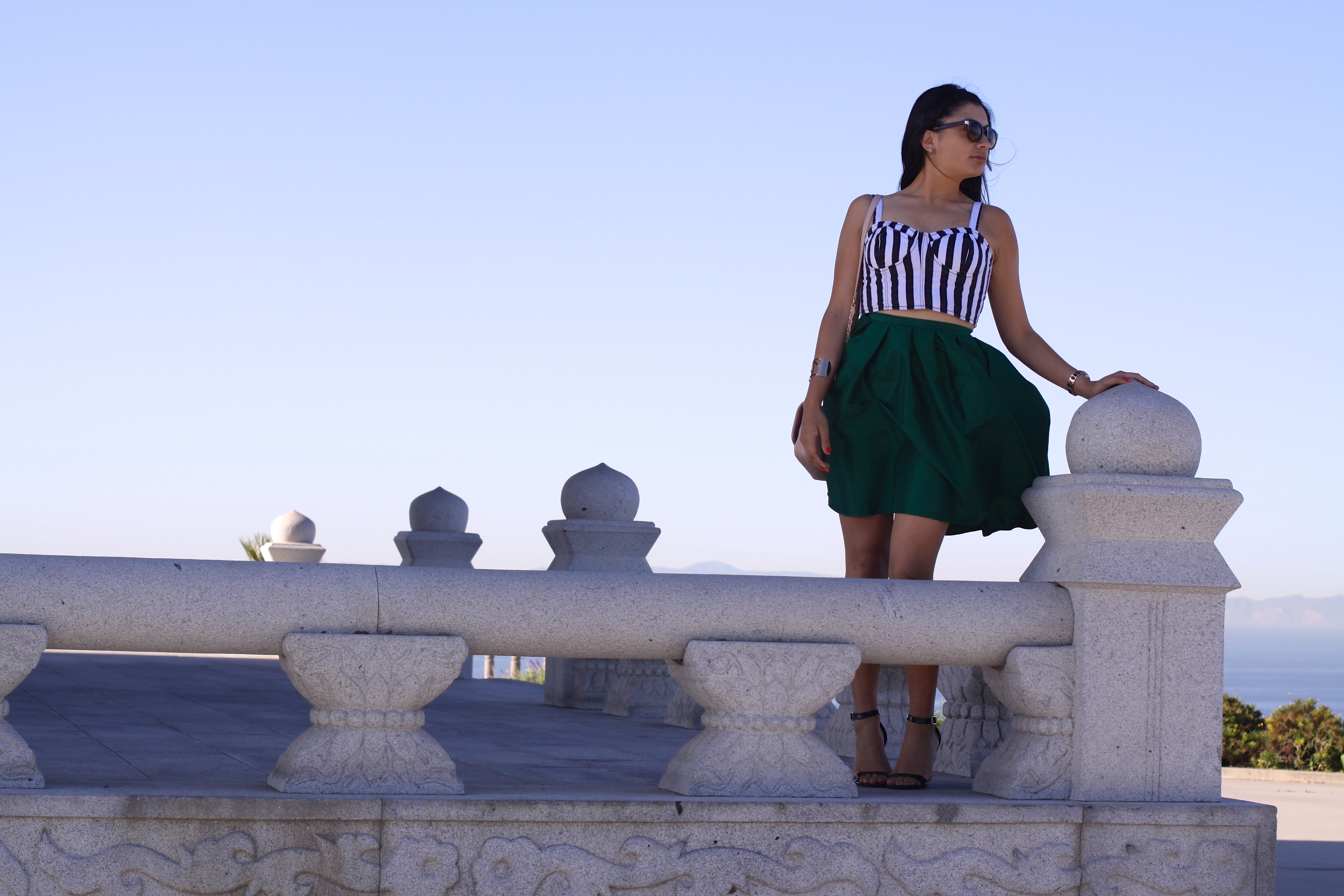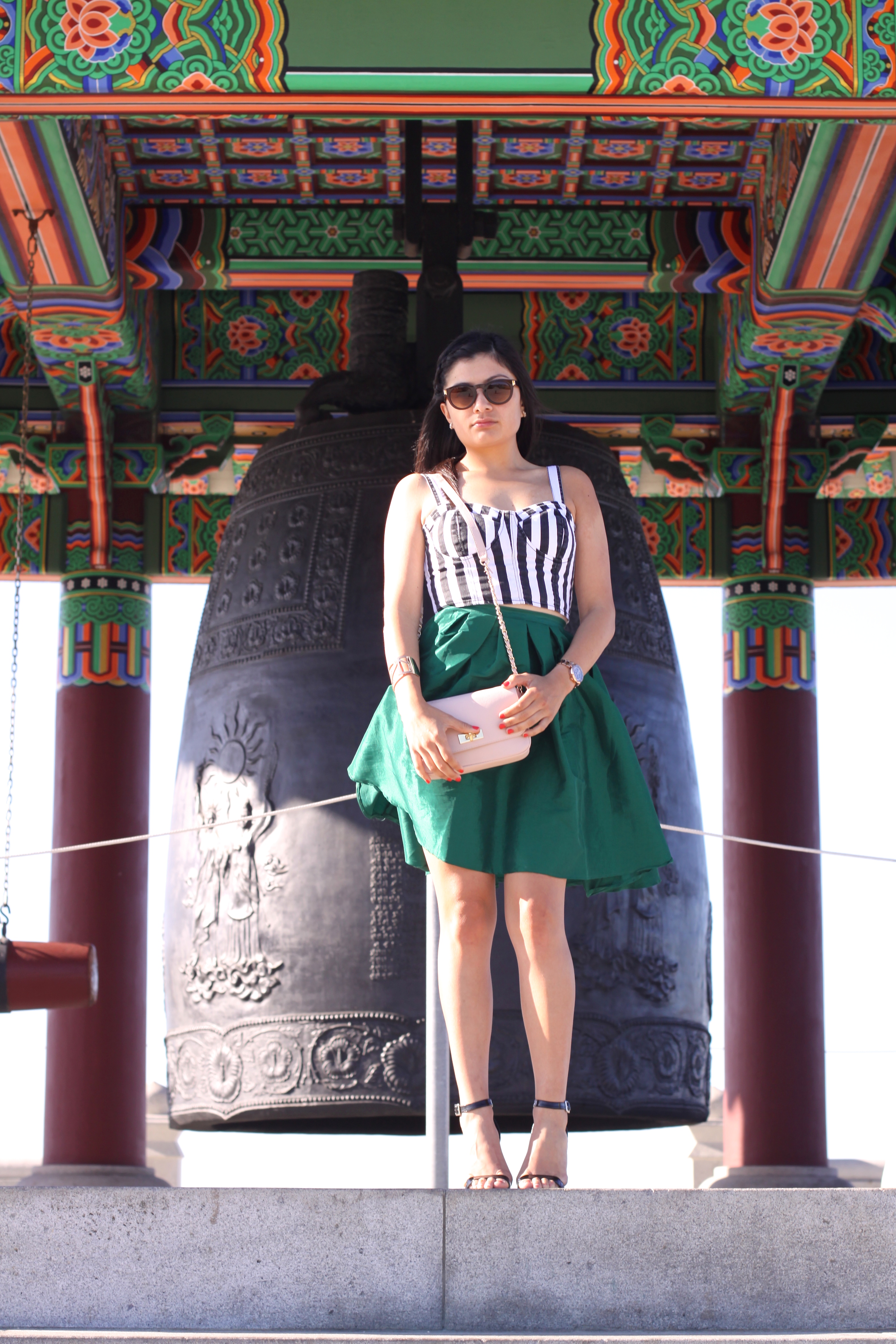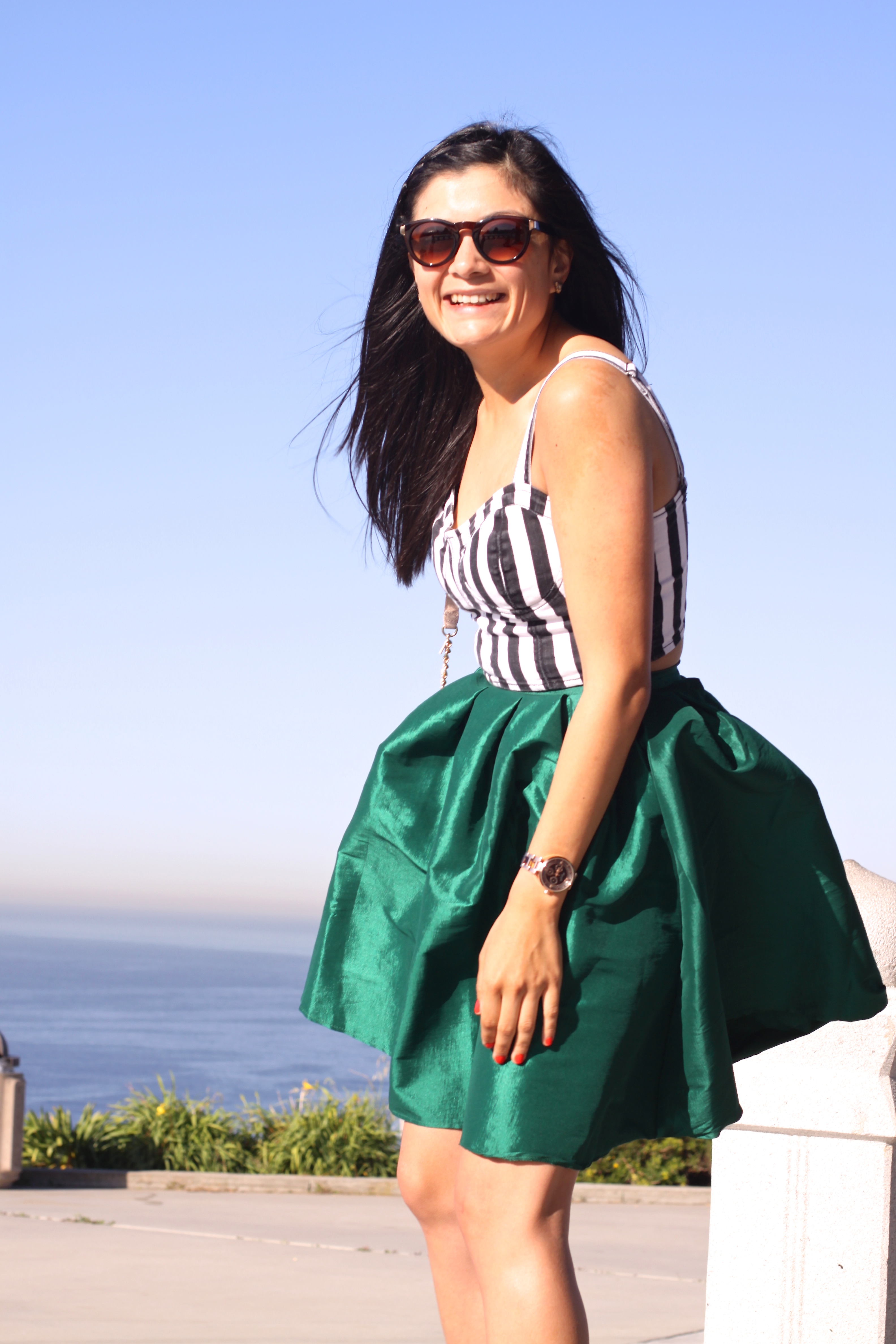 {Sheinside.com Green skirt, Forever 21 Stripped Corset top and bag, Olsenboye Only at Jcpenny strappy heels. Target sunglasses}