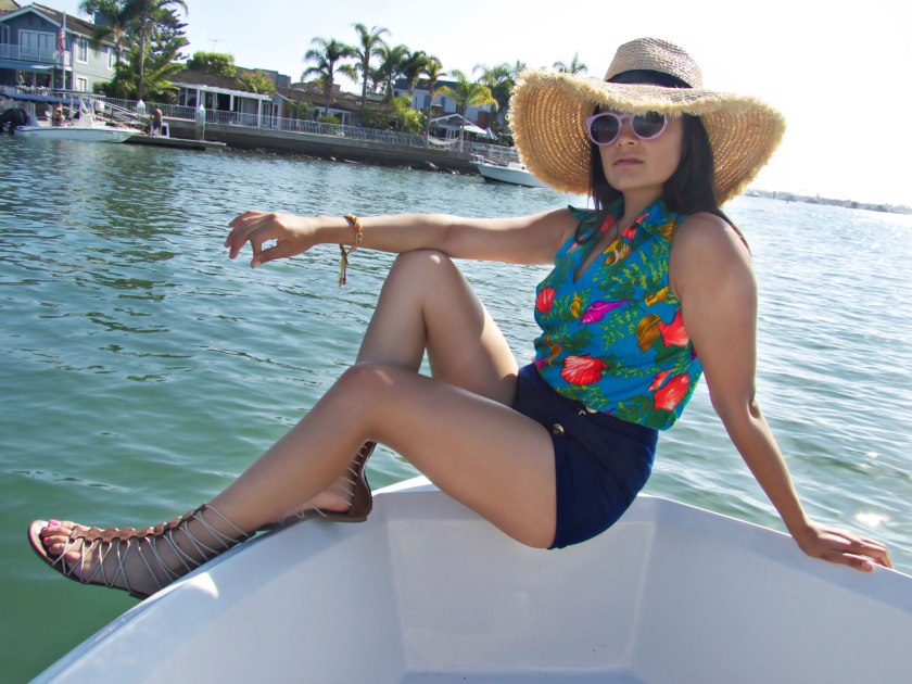 {Top: Ay Que Vintage, Shorts: Forever 21, Sandals: Marshalls,Hat: Zara} This past weekend I celebrated our eight year anniversary with my love by surprising him to a ride/picnic on a boat. I wanted to surprise him with something that I know he loves to do. Riding the boat by the beach reminded me of the movie Sabrina. Its one of my favorite movies of all time, I imagined how she seemed so happy while sining the banana song and it was the moment when Humphrey Bogart’s character truly falls in love with Audrey Hepburn’s character… call me cheesy, but maybe I wanted to build that kind of romance with my love. I got a feeling of peace and serenity as we listened to good ol’ 60’s rock music in the open sea, from The Beach Boys to The Beatles. I loved everything about it. I wanted to embrace and show case the open sea with my outfit with a mix of the Caribbean.