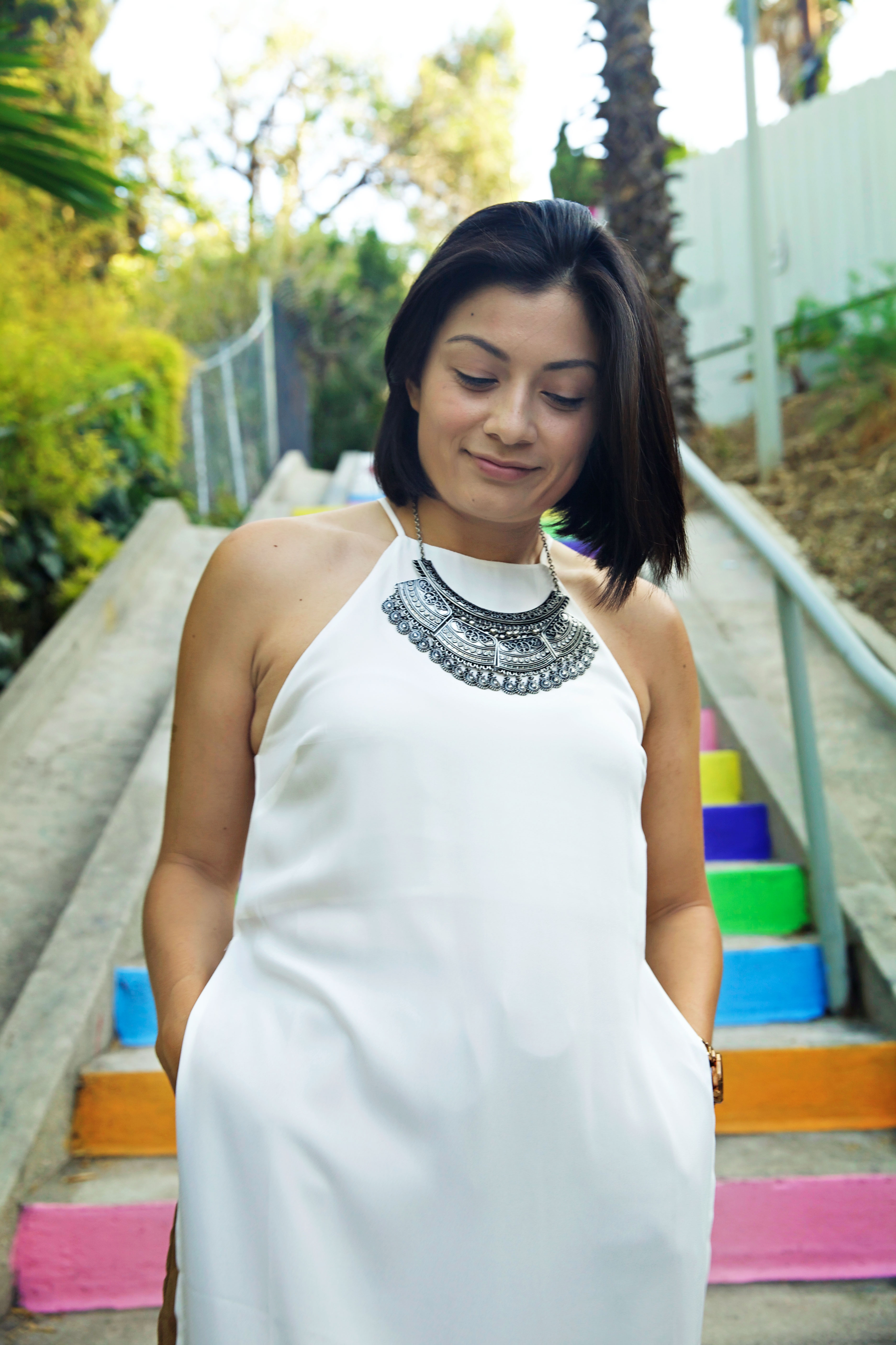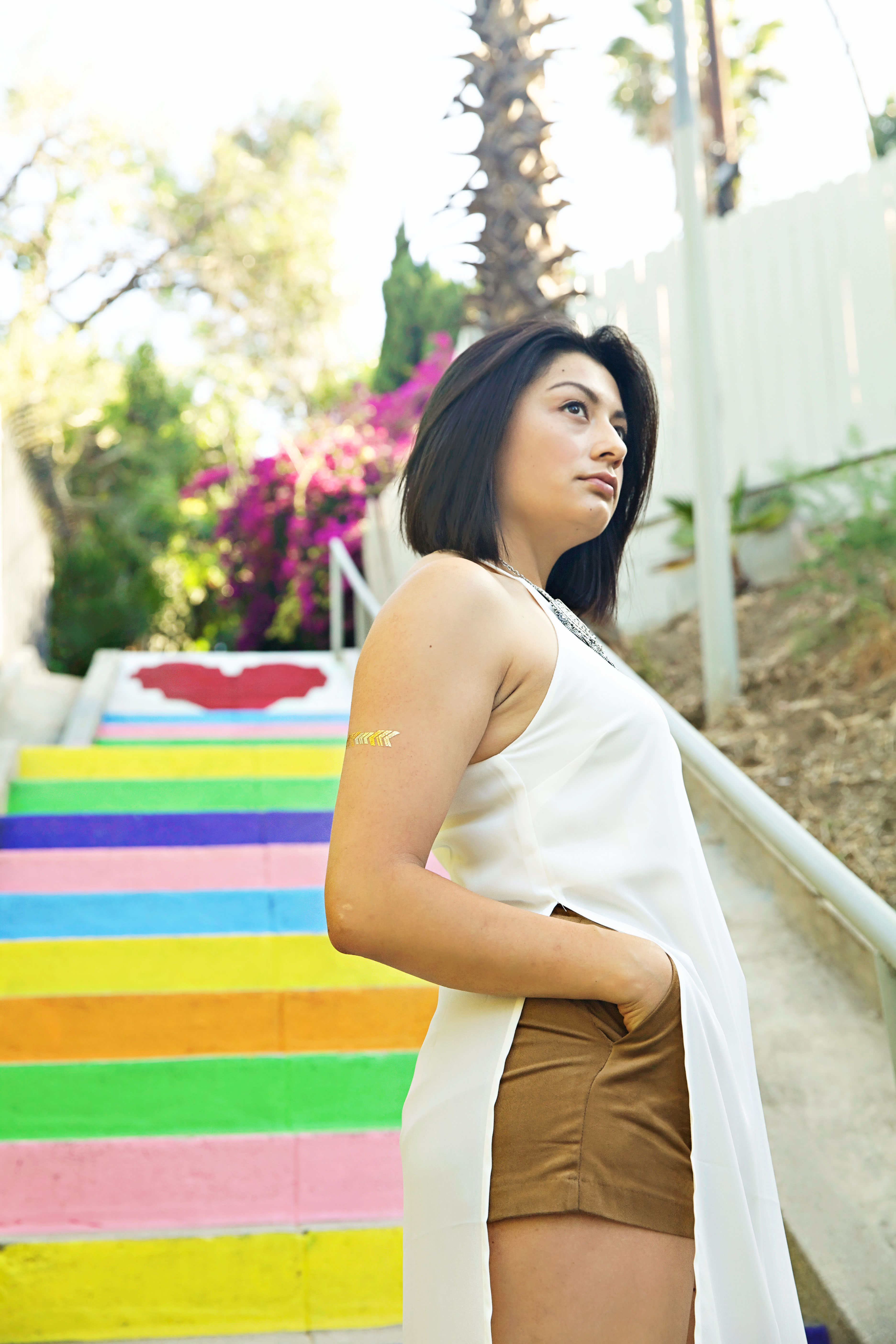 I love the structure of the top/shorts and the delicate fringy thing goin’ on with the shoes! Wowzers, what a great look on the rainbow stairs! xo