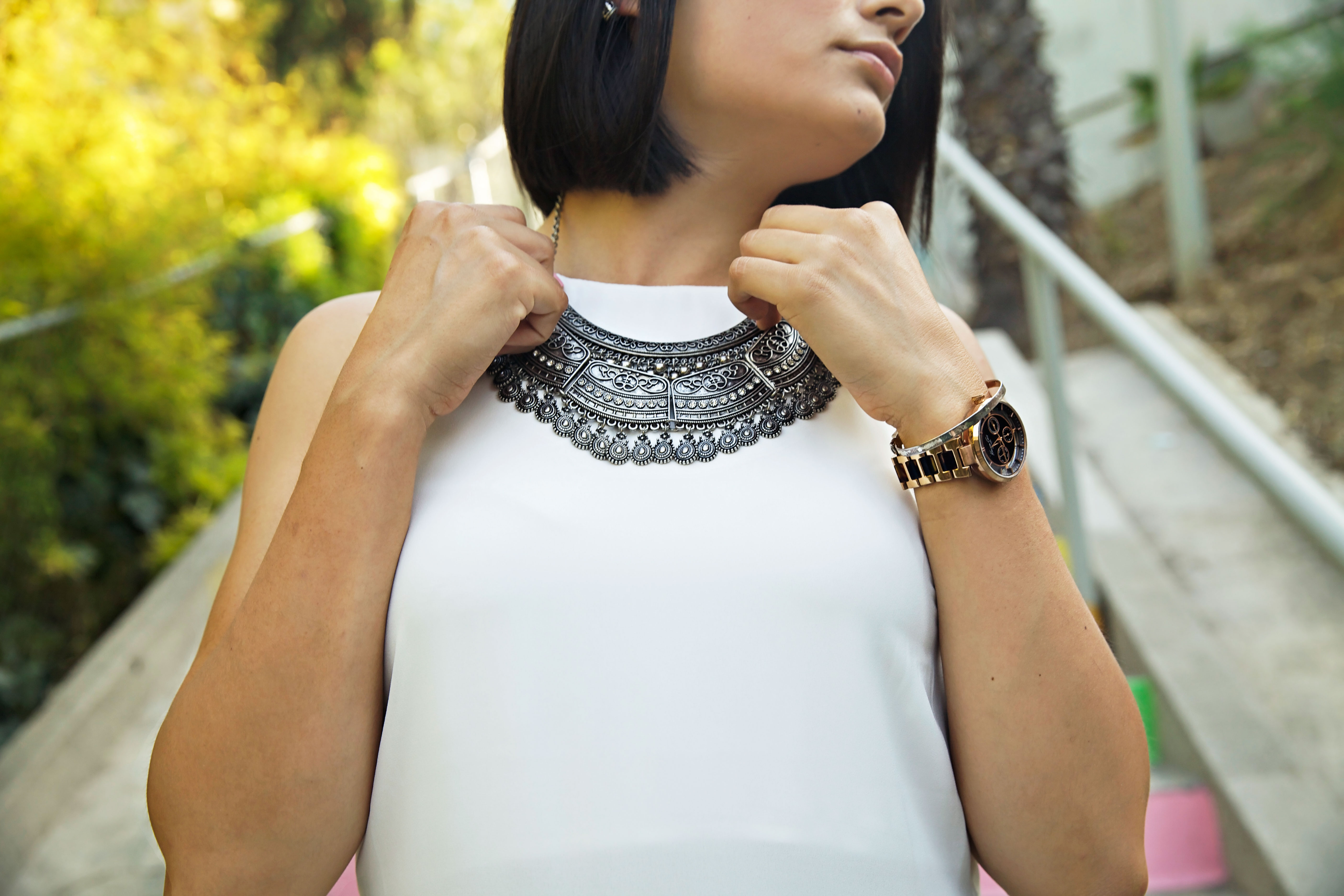 H & M- Camel Shorts Forever 21-Long Line High Slit Racerback top Blue Fringe Heels Statement Necklace