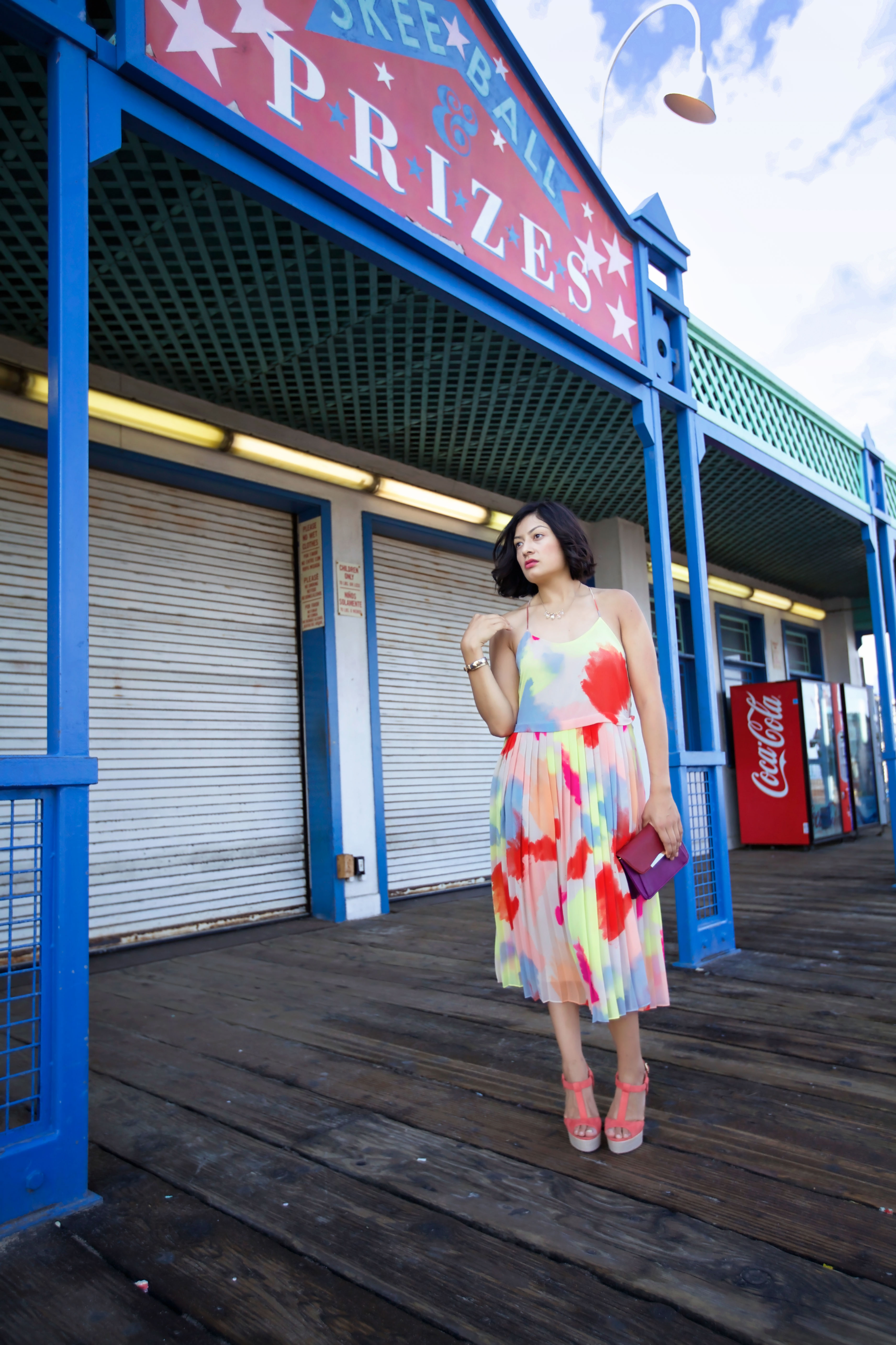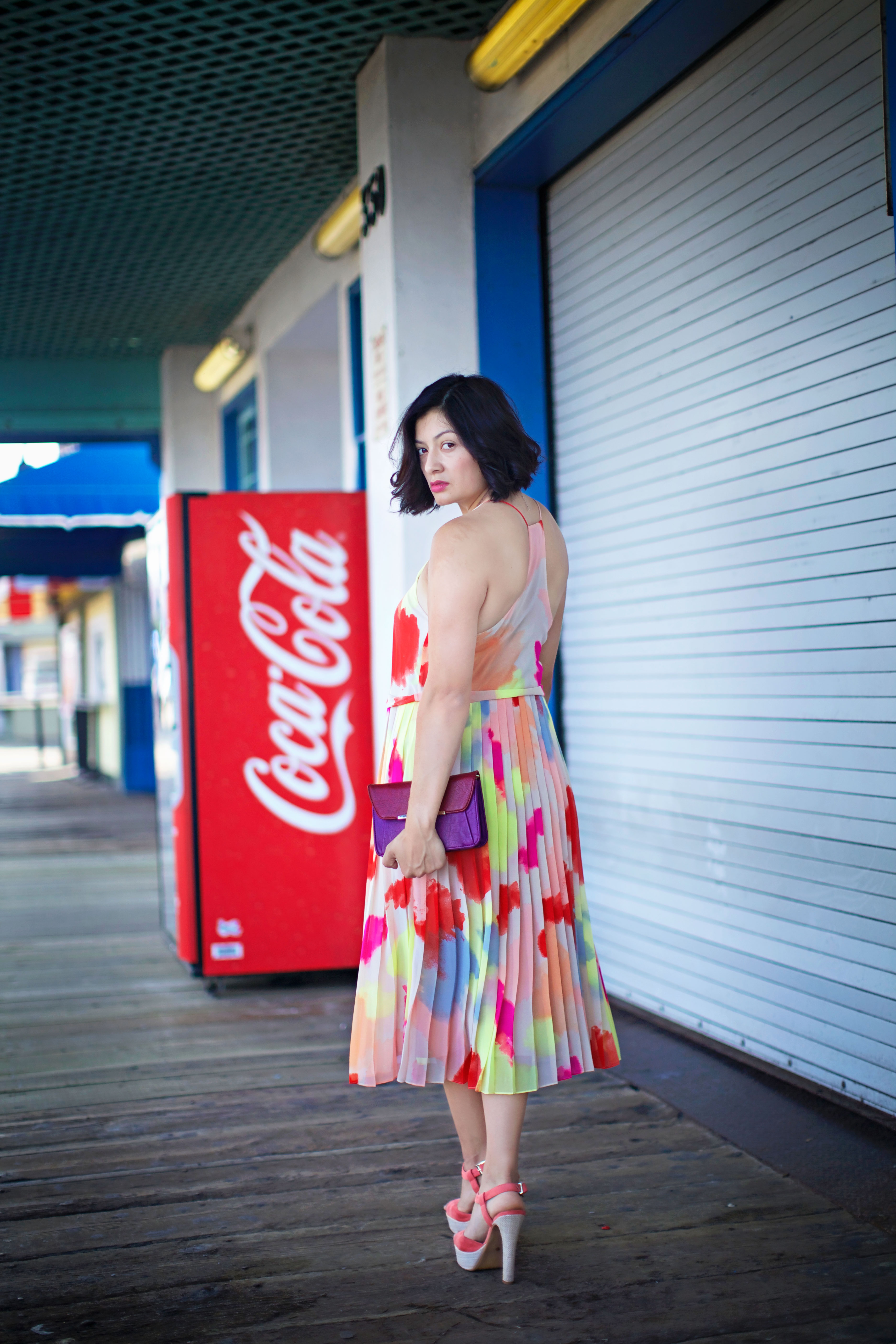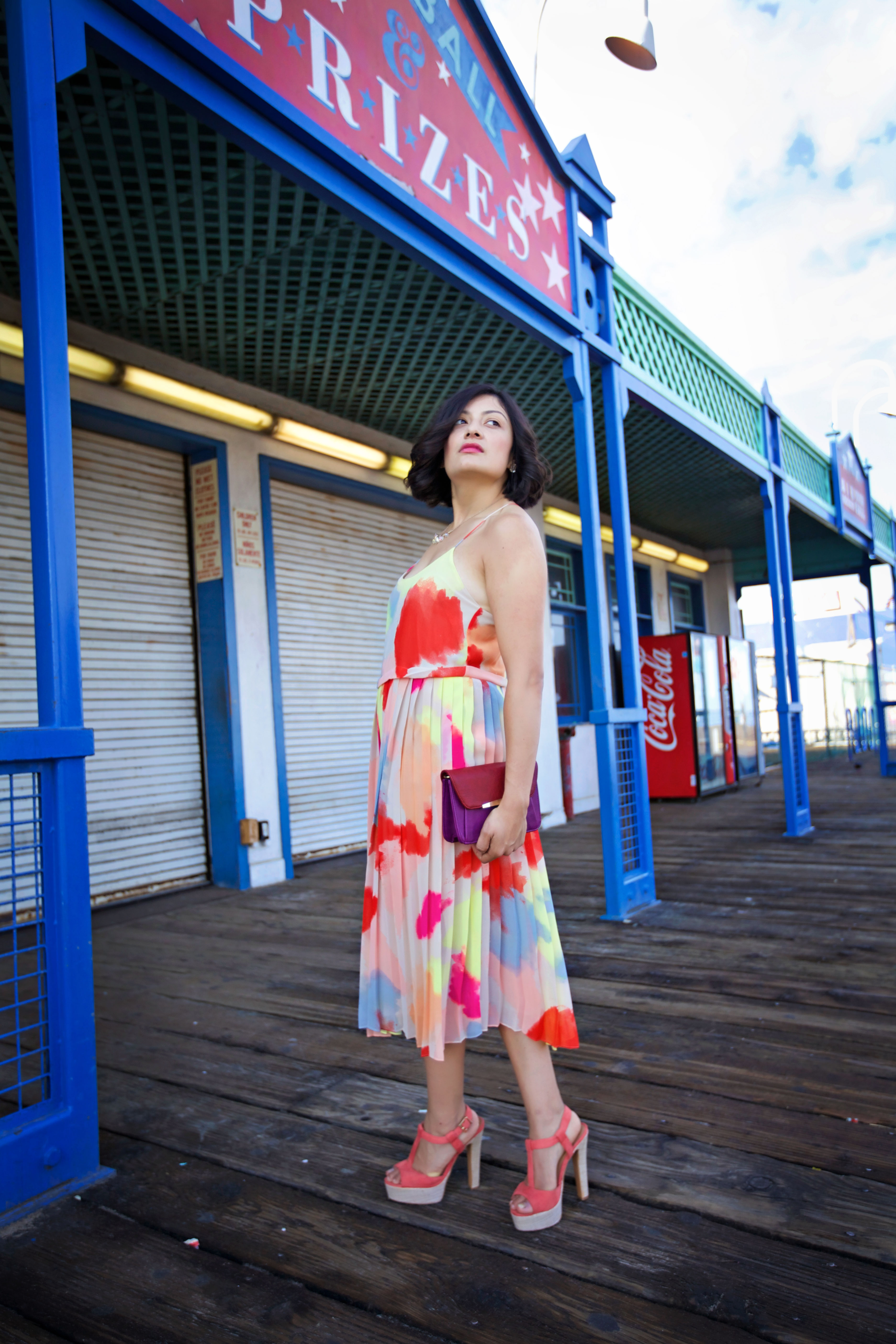 I wanted to start preparing myself and say catch you later summer by wearing this gorgeous dress.  This dress automatically makes me feel like I am traveling in Europe enjoying a gelato and walking around the Trevi Fountain.  I’m the kind of person who is a summer junkie I love  being able to enjoy the sun’s rays, while I go to the beach or even as I head out to PCH for a scenic drive.  Don’t get me wrong I am looking forward for fall, but can I just have a couple of days more to enjoy summer with all its might?  I wore this 1.State dress that I’m currently obsessed with- I love the pastel rainbow colors and how the pleats on the the dress are so breezy. They kinda feel like a 1920’s silk dress.  I hope you all enjoy the last days of summer to there fullest!!!